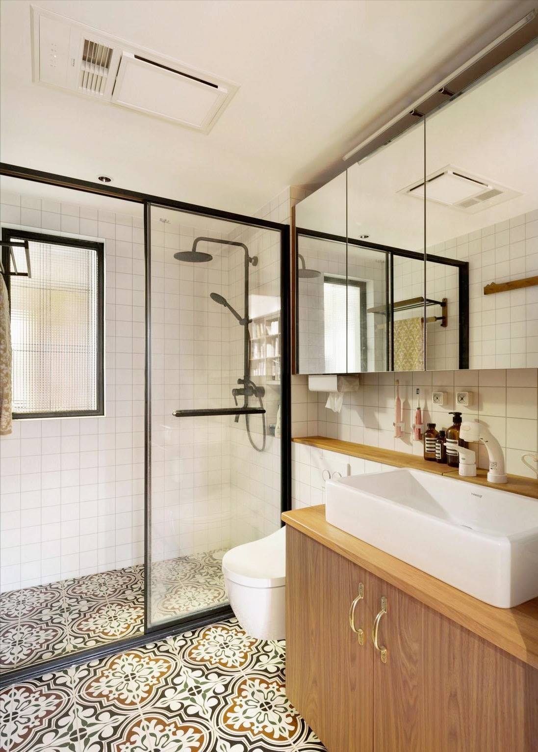 最后,是全屋唯一的卫生间。白色墙砖搭配花砖地面,营造出整洁时尚的效果。功能强大的洗漱台配有镜柜,延伸至壁挂式马桶的正上方,下方的置物台面方便拿取洗漱用品。本文就到这里,感谢阅读。