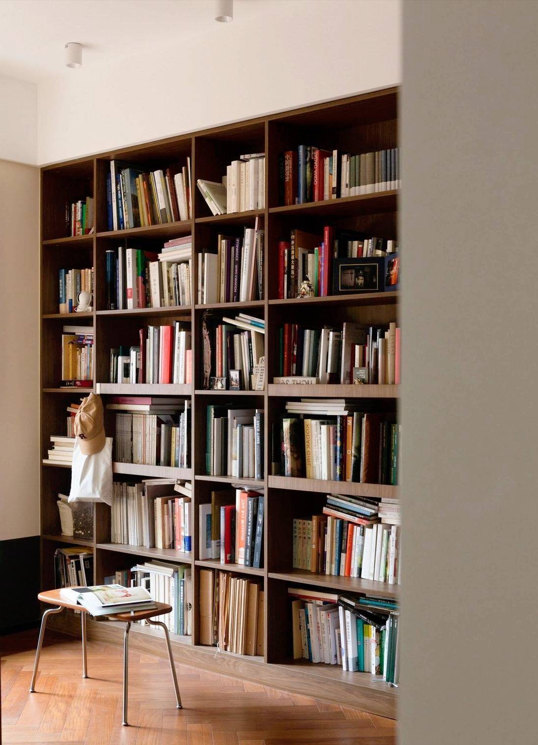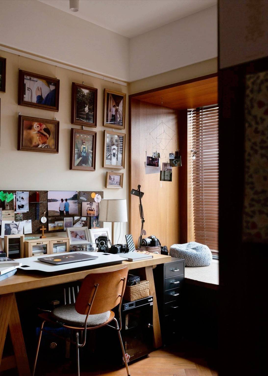 书房面积较小,因此采用开放式设计,与通往卧室的走廊连为一体,显得更敞亮。左侧设开放书柜,右侧放书桌,便于阅读、学习和办公。