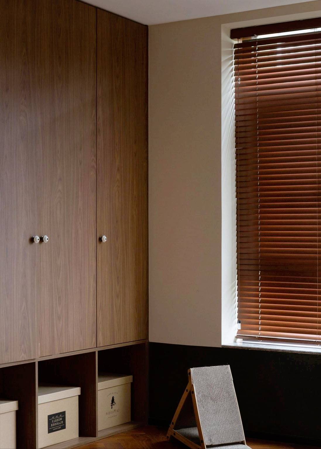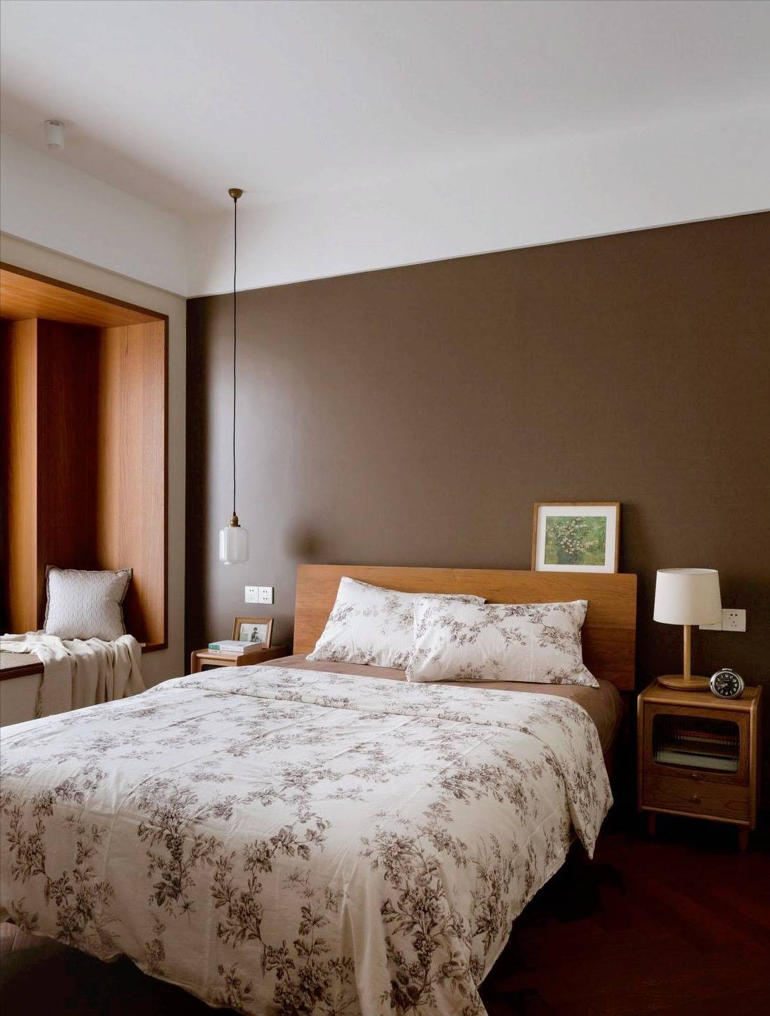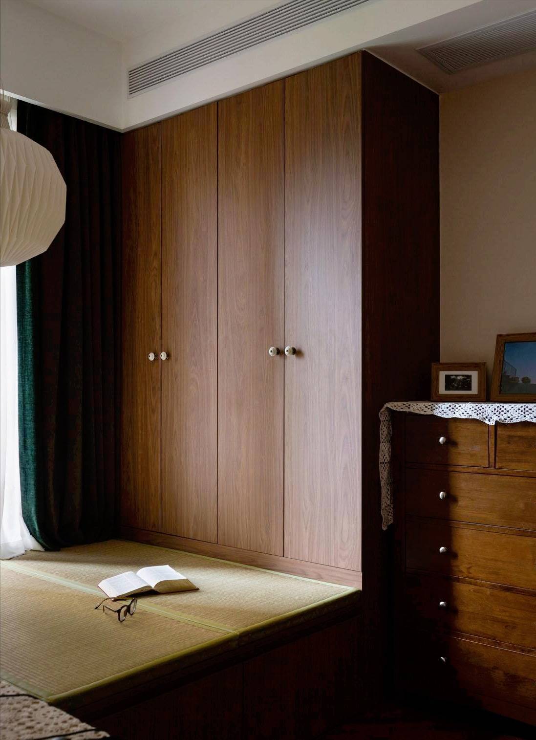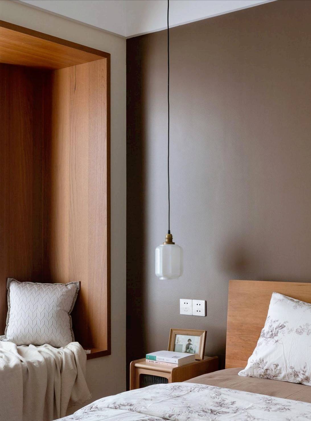 主卧硬装延续了简约风格,床头背景墙刷了墨绿色乳胶漆,提升空间质感,营造复古温馨氛围。白色顶面中和了墨绿色,避免光线不足。木质简约寝具和木质窗套的飘窗,整体显得舒适大方。