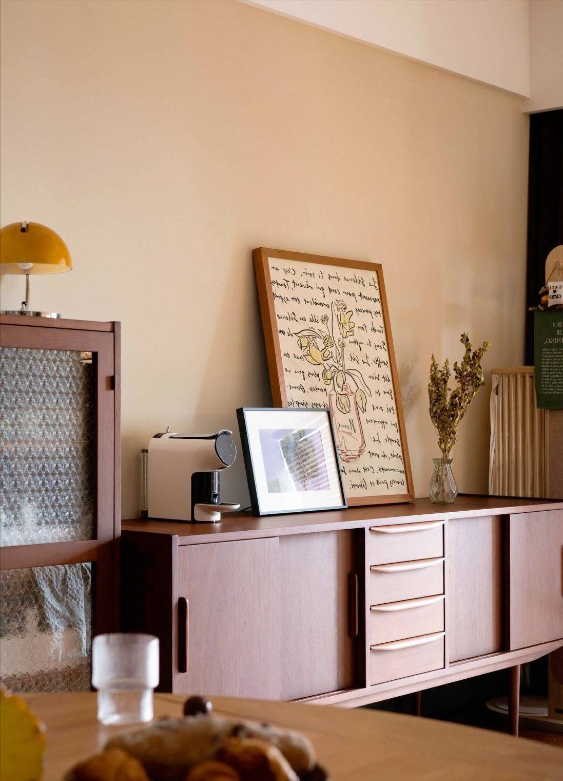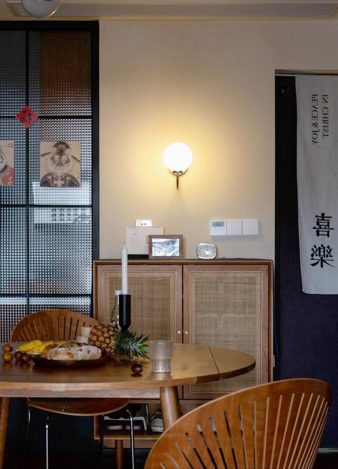 餐厅和客厅采用一体化设计,顶面、墙面和地面一致,增强视觉延伸感。左侧靠墙的成品餐边柜选用压花玻璃柜门,配上右侧背景墙的墨绿色拼色设计,彰显复古高级感。
