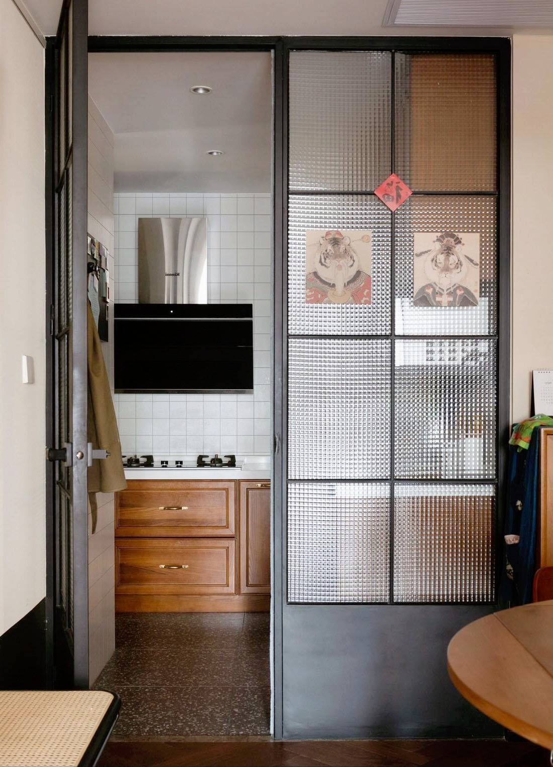 厨房门采用黑框结构搭配双方格压花玻璃,呈现出复古精致的效果。内部装修选用文艺白色墙砖,搭配石膏板平顶和水磨石地砖,同样美观。另外,厨房有一个生活阳台,但未提供实景图,无法展示。